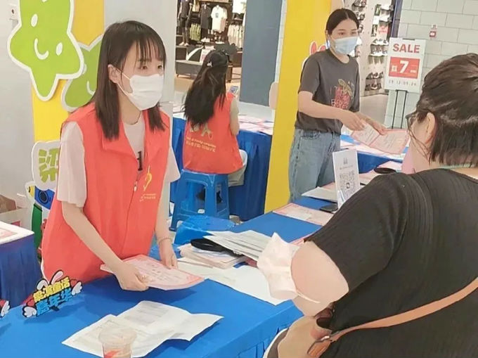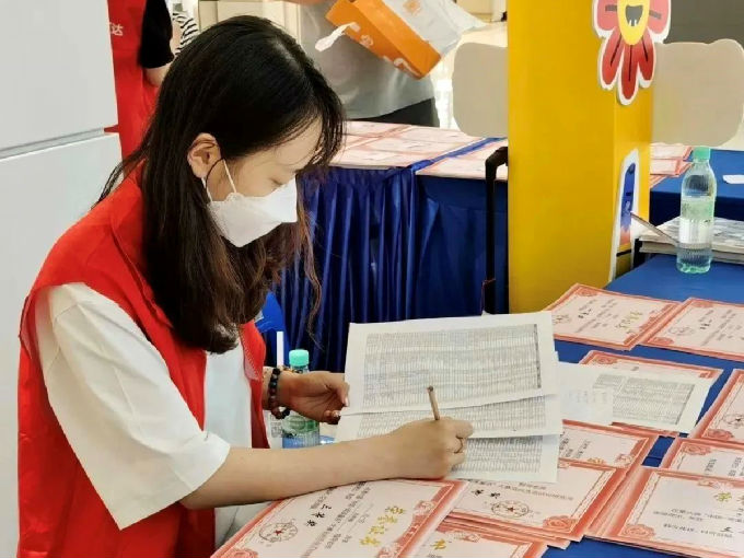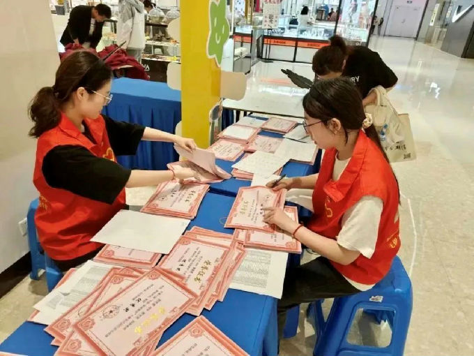 接着,随着小朋友和家长们接踵而至,而同学们面对人流从容不迫,纷纷发挥能动性为小朋友们找到证书,颁发荣誉。家长和工作人员的肯定与鼓励源源不断地激励着同学们。遇到脾气急躁的家长,同学们沉着镇定,耐心解释。同时,同学们热情地号召市民朋友参与“游戏打卡”活动,充分发挥奉献精神,弘扬尊老爱幼的优秀传统美德,家长们的积极回应与幸福笑容亦是对活动及同学们的最好回馈。