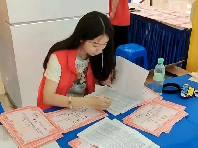 “全心全意为人民服务”是党的宗旨,活动伊始,学生党员身穿志愿服、佩戴党徽,耐心地服务领取证书的家长和学生。虽然在一开始因为工作不熟悉而出现效率不高的情况,但学生党员志愿者们精神饱满、意气风发,分工明确,协同作战,不断在工作中汲取经验,确保了分发证书工作顺利且高效地进行。