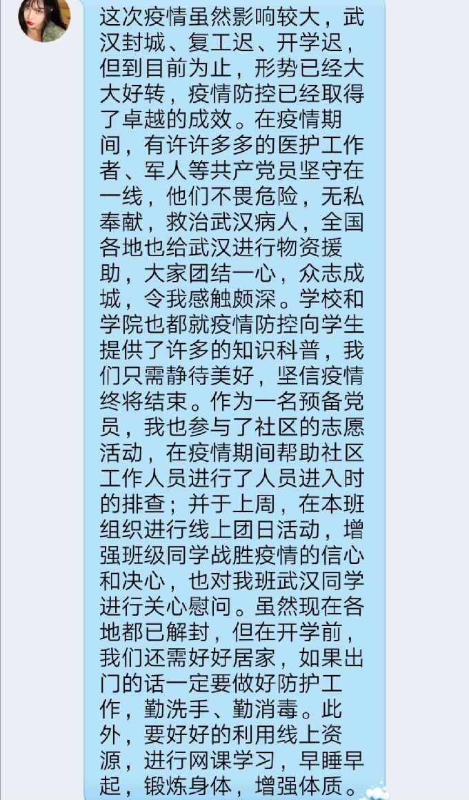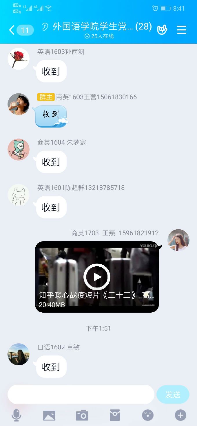 为进一步深入贯彻习近平总书记对新冠肺炎疫情防控工作的重要指示精神充分发挥支部党员的先锋模范作用,提升支部凝聚力。3月26日下午,外国语学院学生党支部通过QQ网络学习群开展了一次“战‘疫’云党会”会议。本次会议主题为战“疫”云 党会,坚定抗疫心,由学生外语支部任老师主持,25名正式党员及预备党员共同参加。