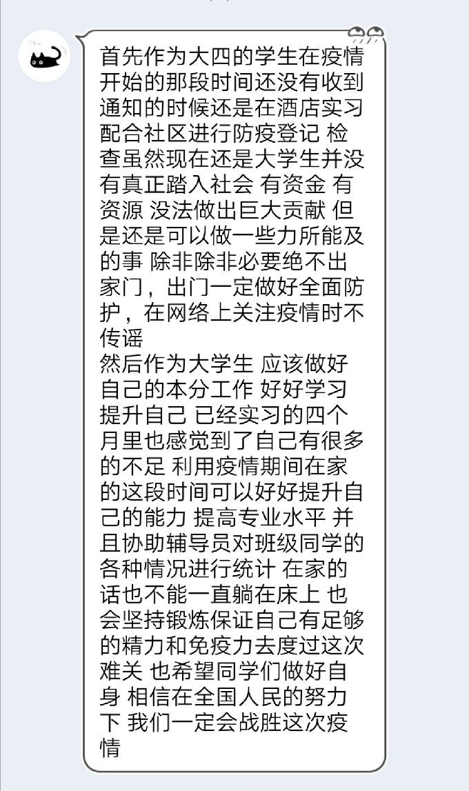 纪录片观看结束后,学生党员们以这次疫情为主题,结合自己的日常生活学习情况踊跃发言。姚梦颖同学和大家分享了自己的感想。姚梦颖表示:“疫情就是命令,防控就是责任。我作为一名预备党员,应带头服从学校一切防控的相关部署和要求,积极做好疫情防控的宣传引导工作,帮助同学们正确认识疫情,不造谣、不信谣、不传谣。”刘亚岑同学结合自己的线上学习情况发言说:“线上学习要求我们自律,同时也需要给自己定一个明确的目标并坚持达成目标。学习之外也不要忘了锻炼,毕竟身体是革命的本钱。”顾莹同学结合自己的防疫志愿活动经历表示:“作为学生党员,我要做好科学防护,尽自己所能帮助他人,力所能及奉献战‘疫’力量。只要大家团结一心,众志成城,疫情终将结束。”