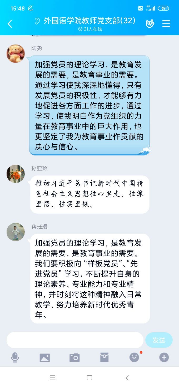 随后,党员同志们围绕本次线上会议的主题内容展开了线下小组讨论,并选派代表在QQ群中进行了学习心得的发言。党员同志们发言积极、讨论热烈。有的党员同志表示:通过组织学习,了解了学校党建工作近况和要求,认为学校各项措施有利于加强党建工作目标管理,提升党建工作规范化科学化水平。还有的党员同志表示:要积极响应党员教育培训工作,充分利用好“学习强国”、“江苏先锋”、“无锡先锋”等党建APP和网络平台,加强正确的意识形态的培养和巩固。还有党员同志表示:加强党员的理论学习,是教育发展的需要,是教育事业的需要。要积极向“样板党员”、“先进党员”学习,不断提升自身的理论素养、专业能力和专业精神,并时刻将这种精神融入日常教学,努力培养新时代优秀青年。