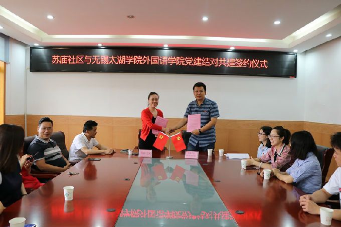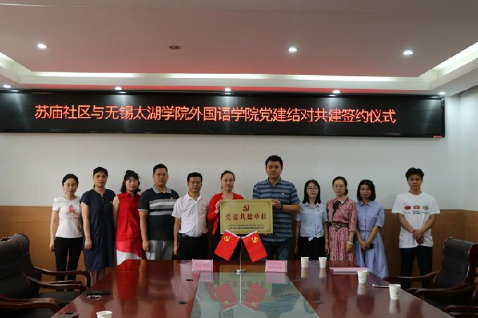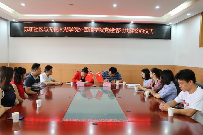 6月19日,无锡太湖学院外国语学院党总支副书记俞昊波带领学生党支部书记任思悦、教师党支部党小组组长姬薇、团总支书记姚靓雯赴钱桥街道苏庙社区。苏庙社区党总支副书记石馨慧、党务员朱佳倩及社区在职党员代表共同参加本次签约仪式。