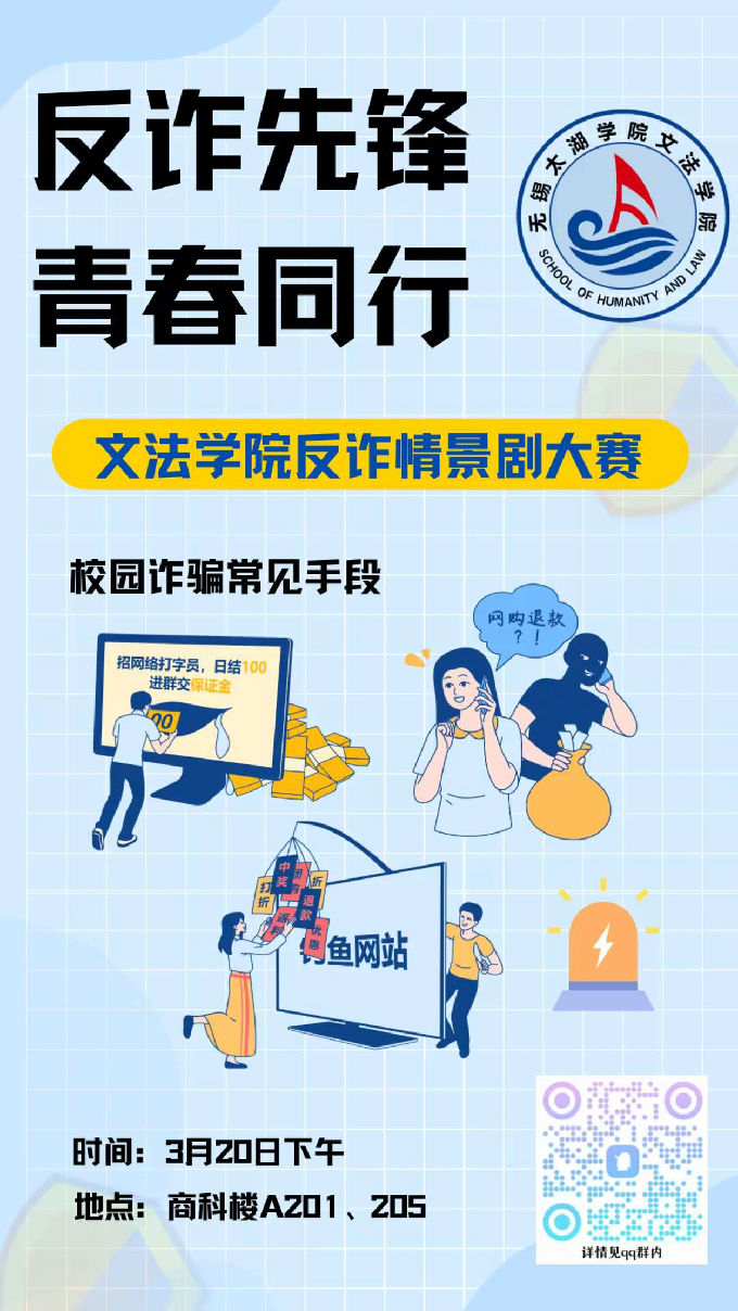 在这个信息爆炸的时代,网络诈骗如同暗流涌动,悄无声息地威胁着我们的安全,尤其是正值青春年华的大学生群体,更需筑起坚实的防线。为贯彻落实省教育厅、政法委、公安厅《关于开展全省教育系统无诈校园创建活动的通知》的文件精神,做到反诈教育入脑入心,切实保护学生生命财产安全,建设“无诈校园”,我校将于3月20日下午开展反诈情景剧大赛。诚邀每一位学子,共筑反诈长城,守护我们的青春岁月。