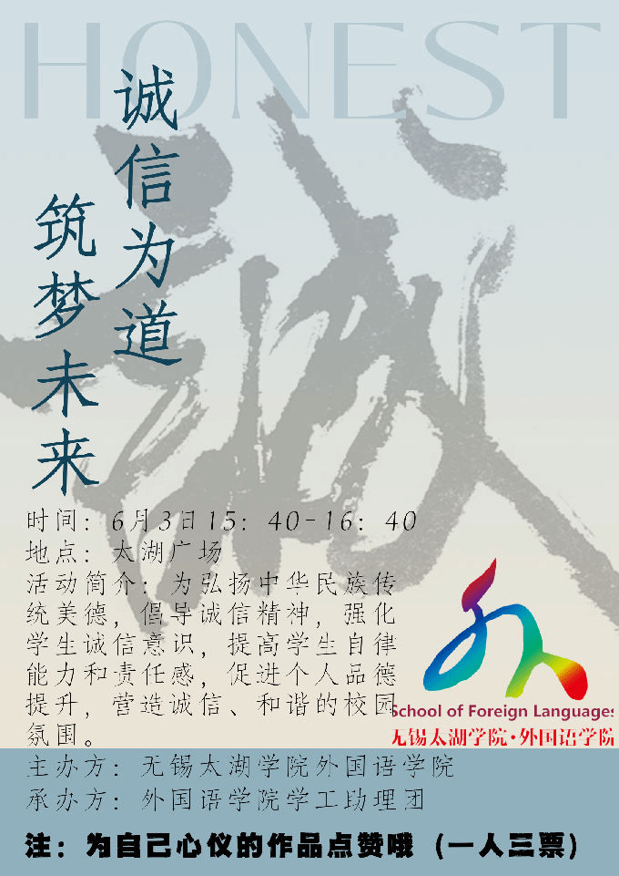 所有参赛者的作品将在太湖广场摊位进行展览,活动设有诚信知识问答、诚信故事分享等互动环节。外国语学院所有同学们可以来现场给自己喜欢的作品投票,一人三票。后期进行票数统计,评选出获奖作品。