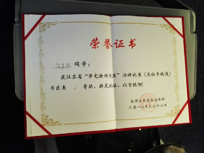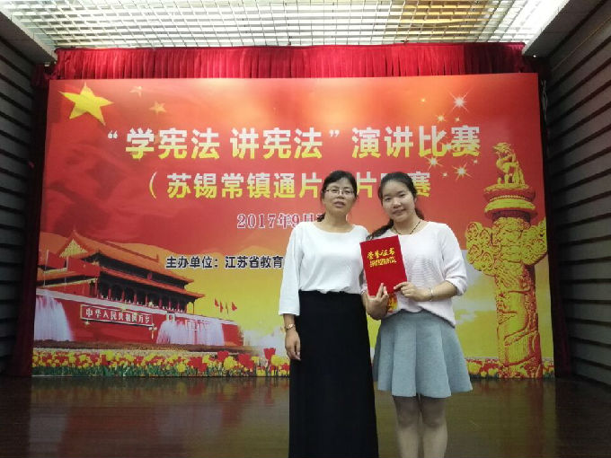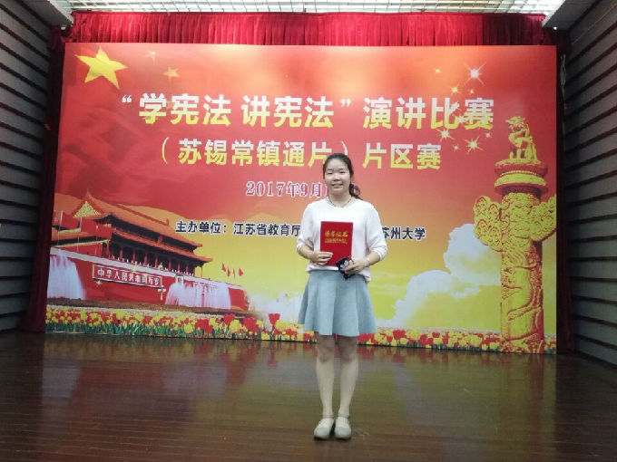 为全面贯彻党的十八大、十八届三中四中五中六中全会精神,深入学习贯彻习近平总书记系列重要讲话精神和治国理政新理念新思想新战略,落实“七五”普法规划、《青少年法治教育大纲》和《关于认真贯彻落实习近平总书记重要指示精神切实加强宪法学习宣传的通知》的要求,由苏州大学主办的“学宪法讲宪法”苏锡常镇通片区赛于9月16日举办,我校外国语学院法学专业法学1502班贺梦雅同学在法学专业老师的鼓励下参赛,在苏锡常镇通的30名选手比赛中脱颖而出,获得江苏省“学宪法讲宪法”演讲比赛三等奖的好成绩。