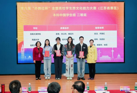 2025年10月24至26日,第八届“外教社杯”全国大学生外语能力大赛跨文化能力大赛江苏省赛区决赛在中国矿业大学(南湖校区)隆重举行。我校三位参赛选手——会计2402姜惠、商英2302张以和以及工商2302魏昌杰在领队指导老师吴洁和指导老师齐丽红的带领下,沉着应战、发挥出色,凭借原创的“中国深蓝电车企业赴挪威洽谈合作”模拟跨文化商务谈判,以沉浸式演绎与专业理论分析脱颖而出,最终荣获江苏赛区本科中国学生组二等奖,为学校赢得荣誉。